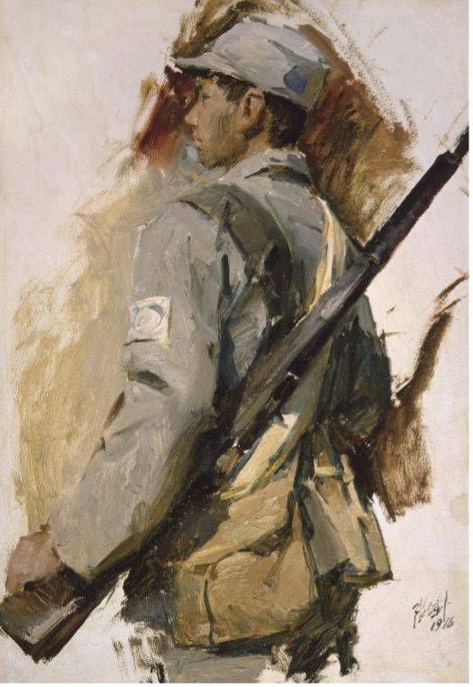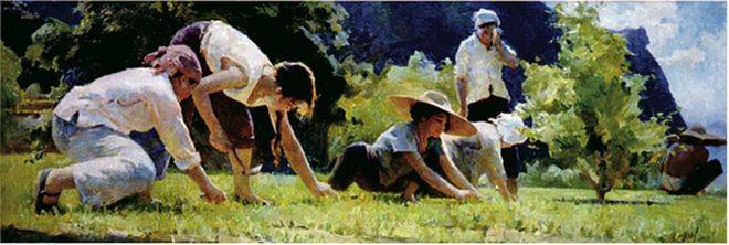 张老师创作态度认真严谨,不允许有一点马虎,一点瑕疵。我第一次去张老师画室时,见墙上挂着一幅名为《红土高原上的欢笑》的油画,表现的是云南傣族青年男女欢快跳舞的场景,构图活泼,色彩帅气。几个月后我再到他画室时,发现这幅作品的色彩对比更加强烈明快,原来张老师竟然又改了一遍。再往后一段时间,张老师对个别人形象又做了调整。《彭德怀在抗日前线》这幅画,原始资料是一张清晰度很低的照片。为了创作,张老师到北京周边山区找同样场景拍照片,画写生,从军事博物馆借来八路军用过的手摇电话机进行参照。在接受国家重大题材《祖冲之》和《张衡》创作任务后,他多次到中科院请教专家,到博物馆查找资料。画面铺完调子,形象初步呈现出来后,张老师又将专家请到画室提意见。所有这些的目的,就是要使自己画面上出现的科学仪器不是主观臆造,服饰符合时代特征,作品更接近历史真实。 大概是当年张老师为画《巍巍太行》,几次到河北涉县和山西左权县搜集素材的情感所至,他一直想画一幅表现抗日英雄王二小的油画。为此,我又两次陪他去太行山走村串乡,寻找当年王二小的足迹,寻找那个年代山村儿童所用的挎篮,所穿的服饰。当时因天气已晚,拍的照片不清晰,后又派人前去重拍。一幅尺寸120×200cm的作品,前前后后折腾了三年多,才终于完成。 在中国油画界谈到色彩表现,大家都佩服张文新,他的代表作《间苗》被评论家称之为“开中国印象派之先河”。2017年,我在伦敦做展览,与一个旅居英国的哈尔滨画家胡东放闲聊,说到中国老一辈油画家,他对张文新赞赏不已。2019年初,我与上海与画家俞晓夫相识,他知道我是张文新的学生后,由衷地说:“中国油画要论色彩,当属何孔德和张文新。他那幅《一往无前》颜色太高级了。”