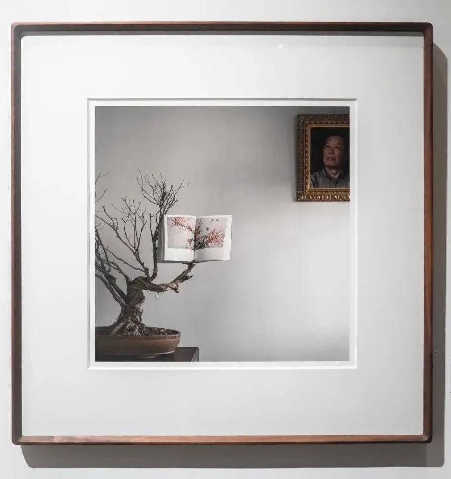 《雨过》丙子年(1996年) 此幅作品尽显米景扬先生花鸟画中生机丰富、清丽自然的格调。画面描绘了雨后初晴的瞬间:一只青蛙伫立于磐石之上,与轻盈停歇的蜻蜓、红艳欲滴的花苞构成一组极富生命律动的乐章。作品构图疏密有致,设定色彩鲜明而和谐。青蛙的灵动与盘石的沉稳形成对比,透明的色彩运用了可能是荣宝斋木版水印工艺带来的灵感。该画作以彩色笔墨捕捉自然、细腻的情趣,蕴含着文人画中难得的清新与诗意。 【肖像区:一张照片里的艺术哲思】 这里展出的,是国际摄影大师山地为米景扬拍摄的专属肖像。照片的构图极具巧思:旧照、画册与花鸟盆景巧妙融合,既呼应了米景扬毕生深耕的花鸟题材,更暗藏深层隐喻——个体生命有荣枯盛衰,但艺术创作留下的精神财富,却能生生不息。山地以独特的摄影语言,褪去了艺术家的光环,捕捉到他最本真的状态,让观众看见艺术背后,一个纯粹的追光者。