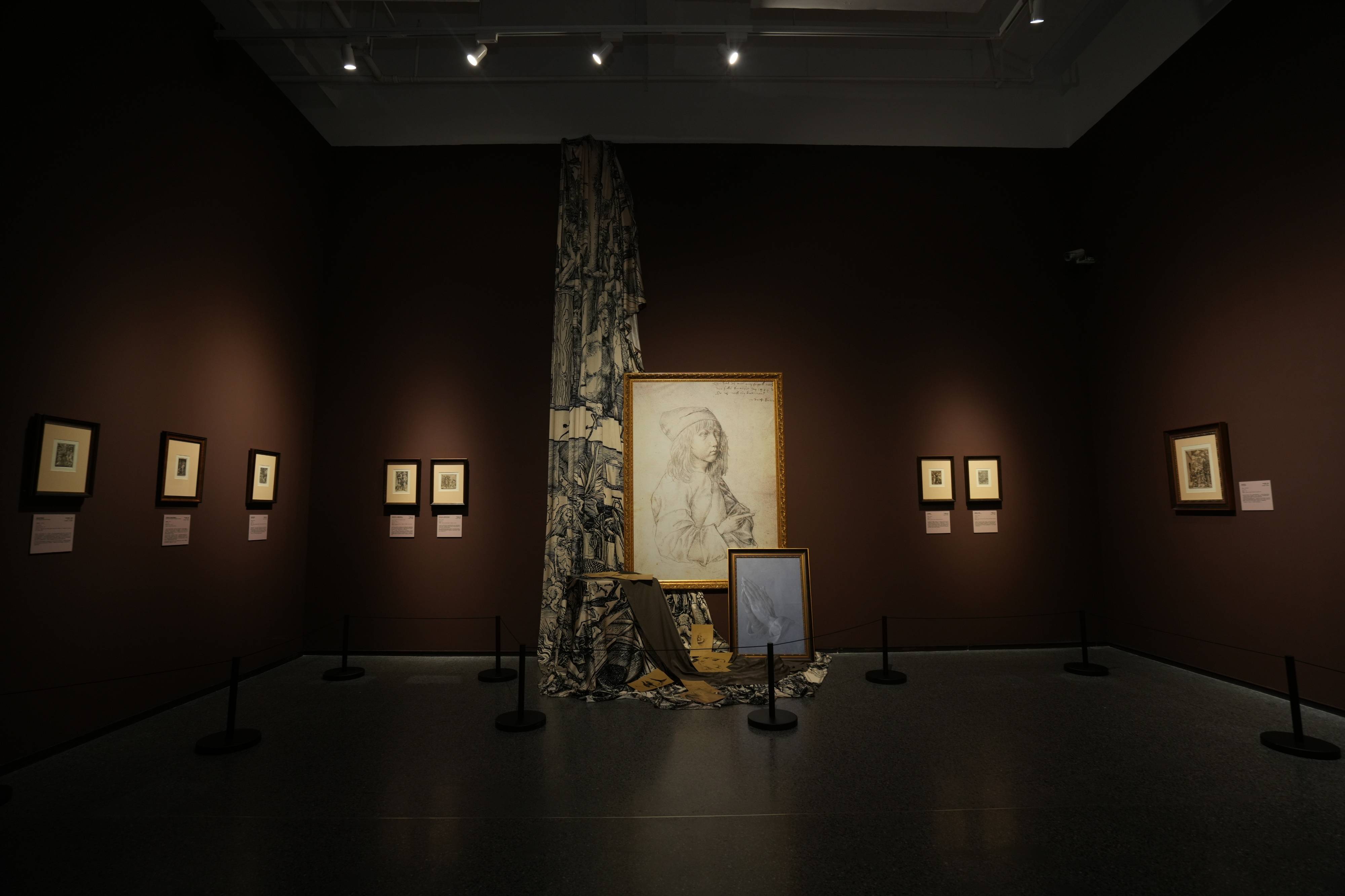 陕西广电融媒体集团卫星电视中心主播部主任李和平主持开幕仪式 本次展览以“双线叙事”巧妙构建观展脉络。主线以时间为轴,系统梳理了从文艺复兴、巴洛克至浪漫主义、表现主义的版画艺术流变。入口处的视觉化年表,替代了传统冗长导览,帮助观众高效建立起清晰的历史坐标。副线则聚焦艺术家个体命运,通过精心设计的三大情境展区,引领观众步入丢勒、伦勃朗与戈雅的生命故事与精神世界。 展览深度聚焦三位欧洲艺术巨匠,以场景化叙事构建沉浸式艺术之旅 在本次展览中,丢勒、伦勃朗与戈雅三位艺术巨匠的专区,通过精心设计的空间氛围、互动体验与场景还原,为观众打造了一条深入其艺术与人生的沉浸式观展路径。 丢勒展区:回溯探索与理性之光 在丢勒展区,棕色墙面与金棕装裱,营造出了十五至十六世纪的探索氛围。其标志性的“AD”签名被投影于墙面,昭示着这位艺术家在版画署名与商业化上的开创意义。空间中,印满丢勒作品的布幔与丢勒十三岁时具有代表性的自画像复制品、《祈祷之手》复制品共同构建了一个立体叙事场,让观众得以触碰这位“一个人的文艺复兴”背后,理性与情感交织的天才轨迹。