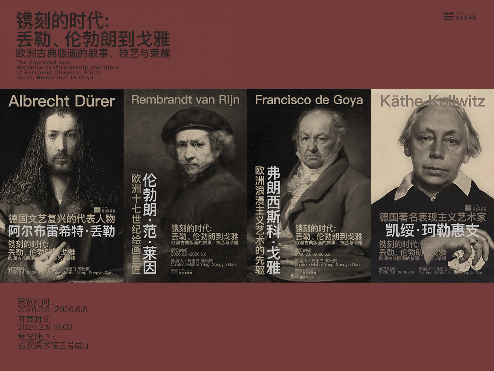 “镌刻的时代:丢勒、伦勃朗到戈雅——欧洲古典版画的叙事、技艺与荣耀”展览在西安美术馆开幕2026年2月6日, 西安美术馆为艺术爱好者带来了一场重磅展览——“镌刻的时代:丢勒、伦勃朗到戈雅——欧洲古典版画的叙事、技艺与荣耀”。展览由西安美术馆、中国文化艺术发展促进协会主办,杨墨白、高松寅策展。展品横跨15至20世纪,汇聚了阿尔布雷特·丢勒、伦勃朗、弗朗西斯科·戈雅及凯绥·珂勒惠支等20余位艺术巨匠的200余幅原作珍品,堪称一部浓缩的欧洲版画视觉史诗。