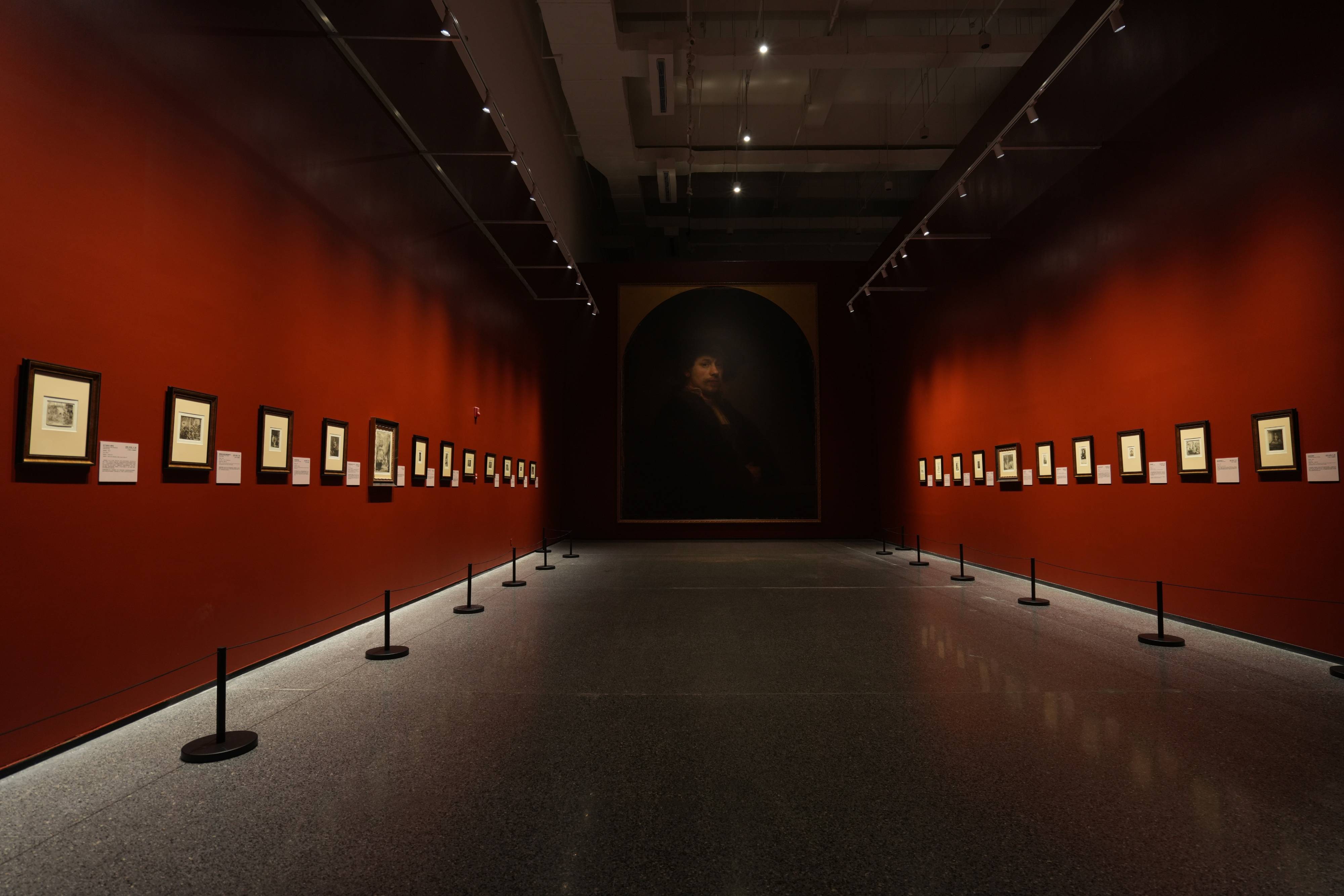 展览现场 伦勃朗展区:光影互动与时代对话 步入伦勃朗的“巴洛克剧场”,暗红基调与拱门元素奠定了戏剧性的历史感。策展人巧妙地利用层高打造的“暗室互动区”,将经典的“伦勃朗光”转化为趣味盎然的体验:观众落座,即可从一面复古镜框中,发现自己被一束精心设计的光线点亮,瞬间化身为大师画布上的主角。随后与两侧真迹及巨幅自画像的对视,则完成了一场跨越数百年的无声对话。