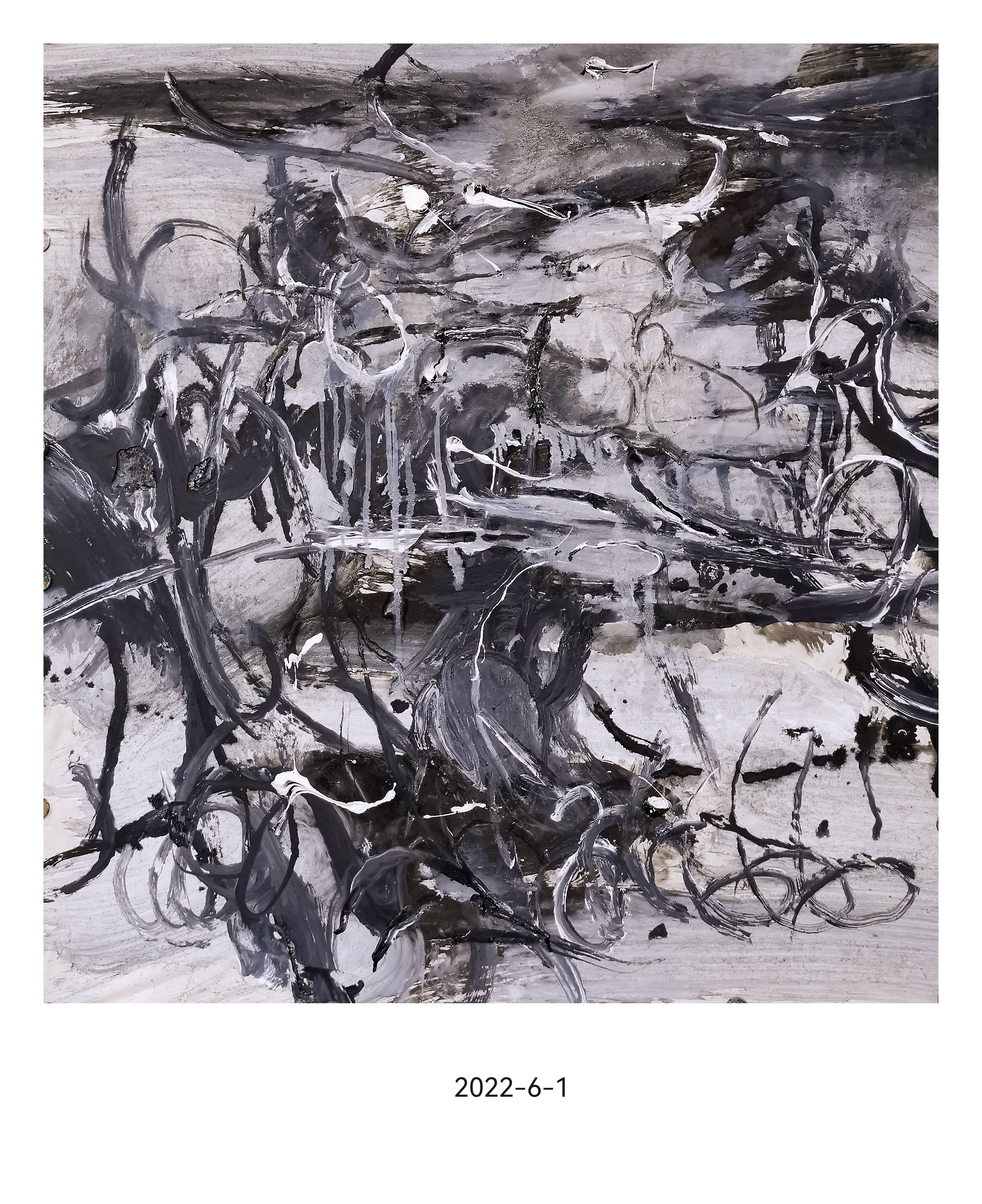 《草木灰线》 2022年 96×97cm 水墨 丙烯 草木灰 尤为值得注意的是,他提出并反复实践的“万物一体”的观念,并非哲学口号,而是一种绘画方法论。画面中的空间往往被弱化甚至消解,形象在水色与纸性中游移,既非抽象,也非具象,而是一种“正在生成”的状态。这种状态拒绝戏剧性,却具有强烈的时间感——观看不是瞬间完成的,而是在停留中逐渐展开。这一点,使他的作品在当下快节奏、强视觉刺激的艺术环境中,显得特别安静,却也格外坚定。